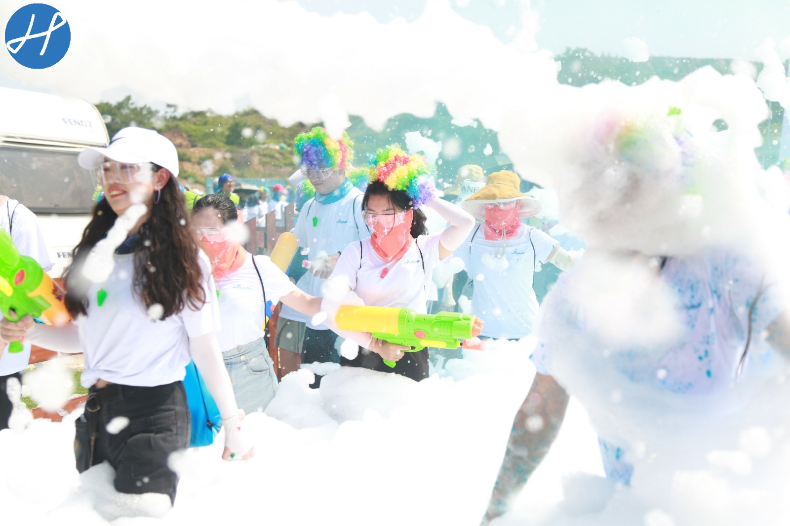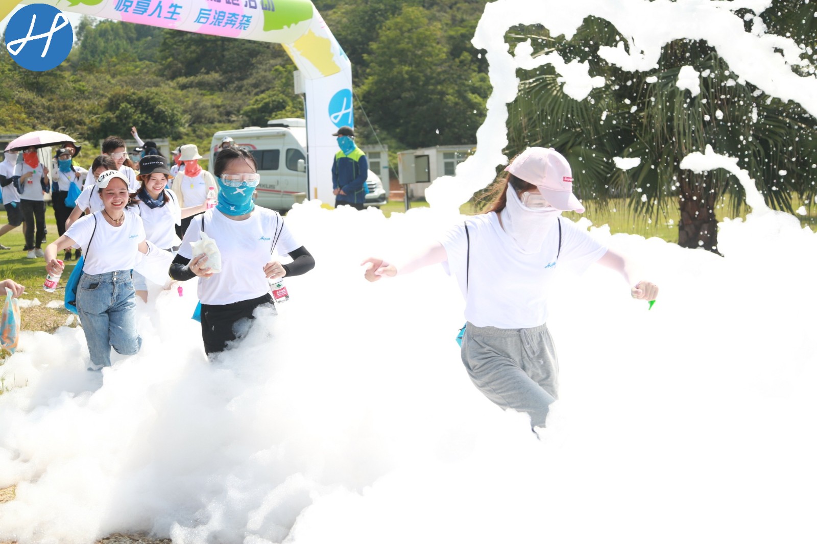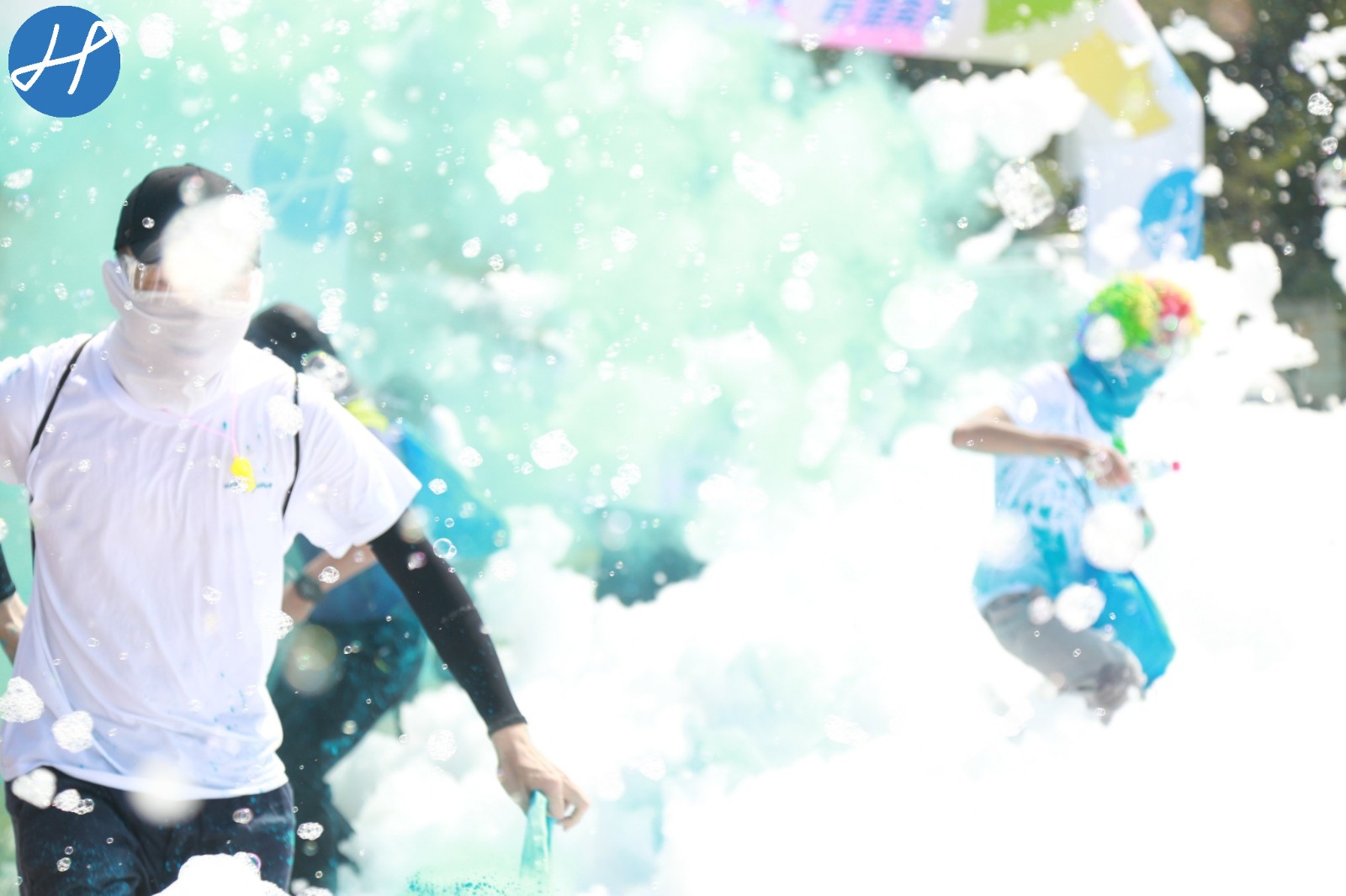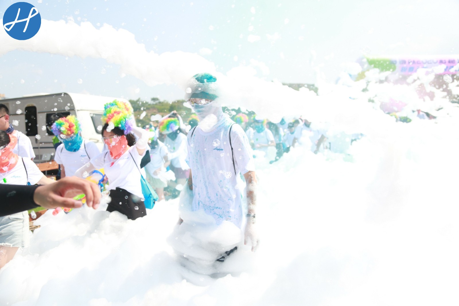 烈日當(dāng)頭照,下午彩跑正式開始,教練分發(fā)重型裝備(玉米粉、護(hù)目鏡、水槍、夸張的頭套等),將快樂和酷炫升級(jí)。在一場(chǎng)激烈的游戲比拼后,各小組穿過泡泡海陸續(xù)出發(fā)。